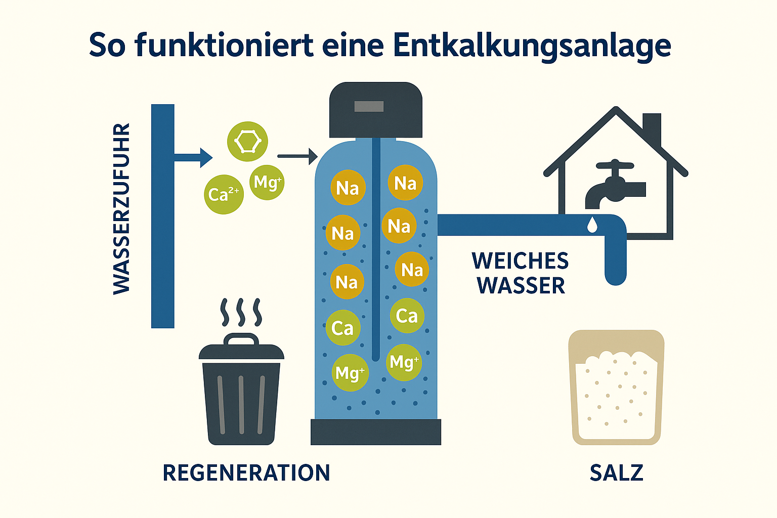 Eine Entkalkungsanlage entfernt Kalk (Kalzium- und Magnesiumionen) aus dem Leitungswasser durch ein Ionenaustauschverfahren. Das Wasser fließt durch einen Harzbehälter, in dem die Kalkbildner gegen Natriumionen ausgetauscht werden.